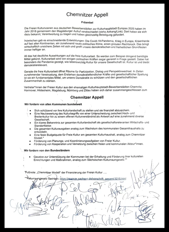 Vertreter*innen der Freien Kultur aus den ehemaligen Kulturhauptstadt-Bewerberstädten Chemnitz, Hannover, Hildesheim, Magdeburg, Nürnberg und Zittau haben sich daher zusammengeschlossen zum